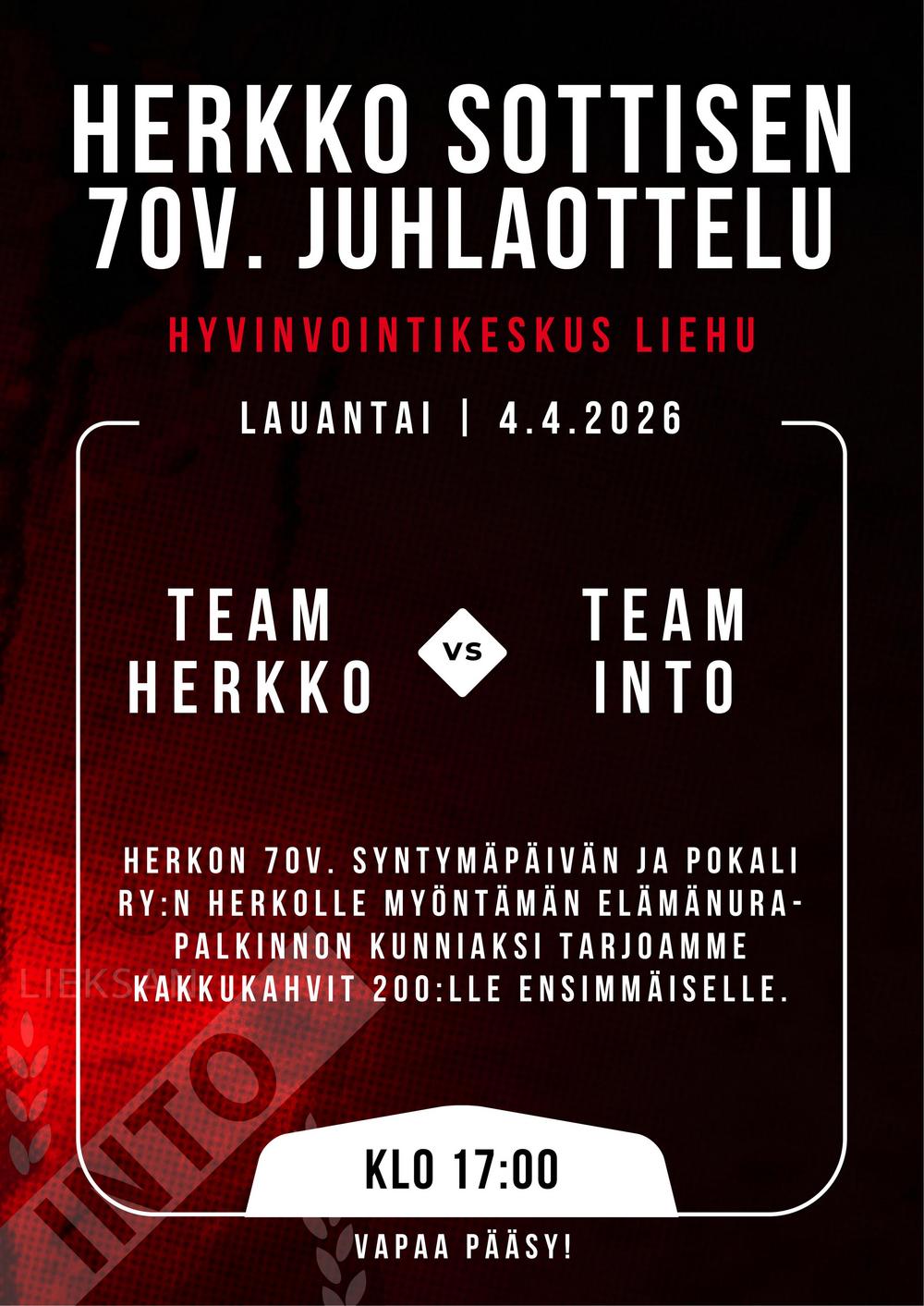 Seuraikoni Herkko Sottisen 70-vuotis syntymäpäivää ja Pokalin Herkolle myöntämää elämänurapalkintoa juhlistetaan Liehussa 4.4. Juhlaottelussa Herkon keräämä joukkue kohtaa Innon junioreista koostuvan…
